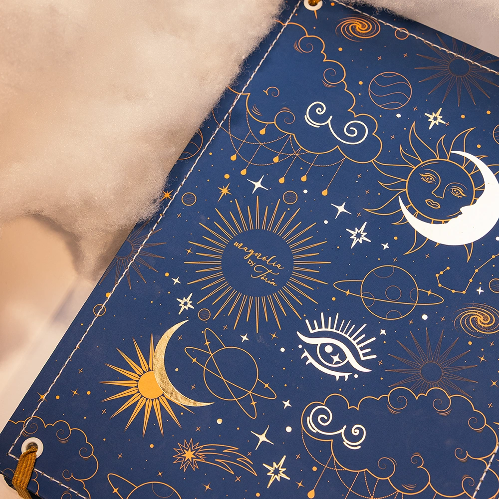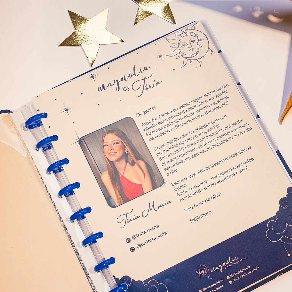 O nosso Caderno de Disco Mystic foi pensado pra transbordar o amor e curiosidade que a Tória sente por signos e astrologia. Cada detalhe dele, as nuvens, luas e sóis refletem os astros, o céu e tudo o que é místico. Um lançamento exclusivo e diferente de tudo que a Magnólia já fez antes, uma peça única e irrepetível dessa collab. É perfeito pra você que não quer ser igual a todo mundo, que quer se destacar e sempre ser mais você.