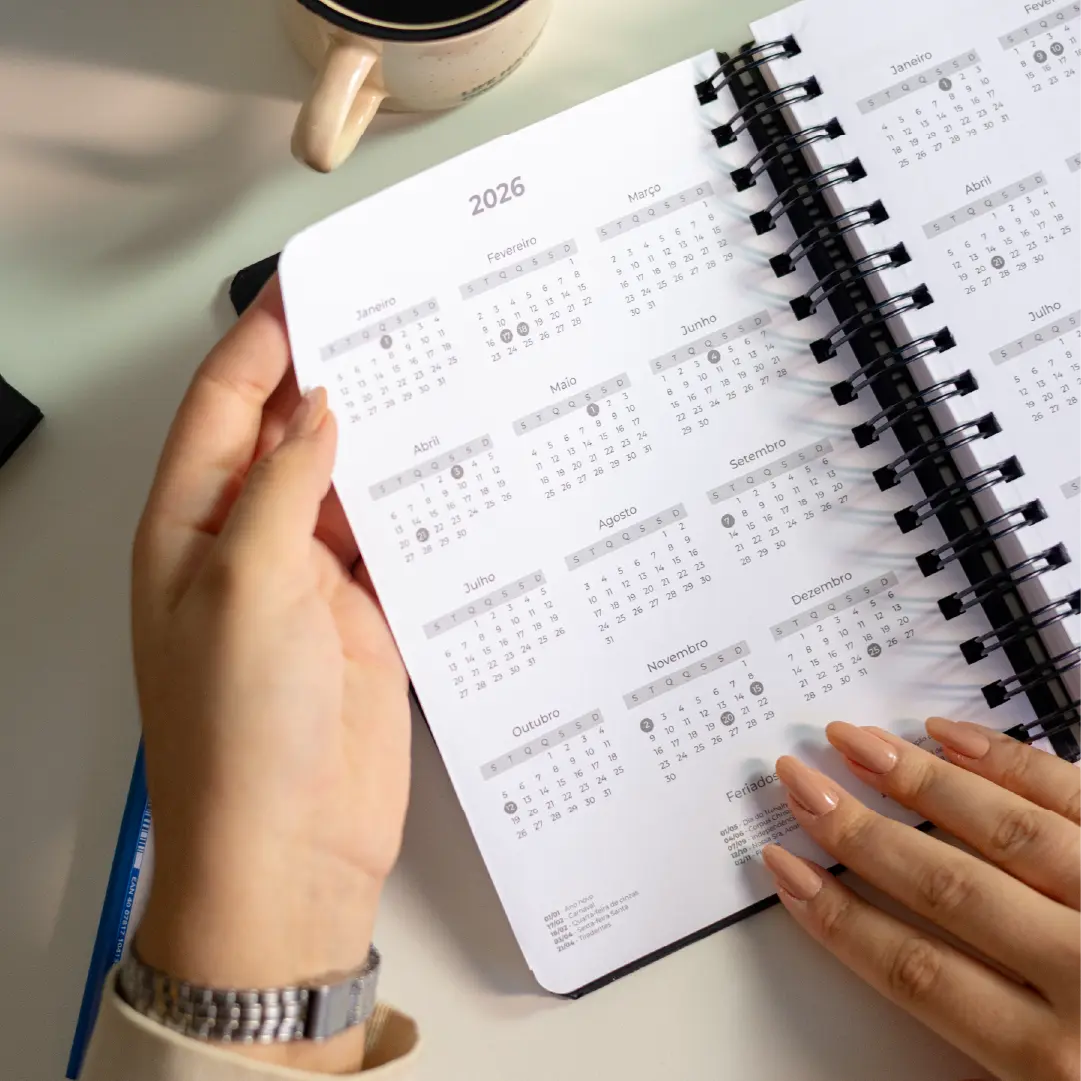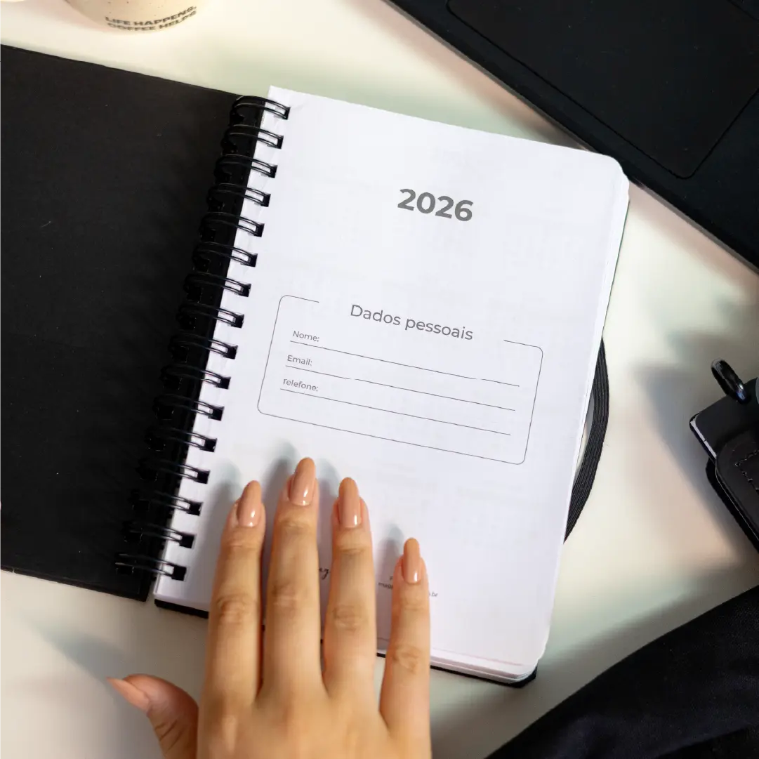 O Planner Diário 2026 Simetria Verniz da Mag é o equilíbrio perfeito entre textura e brilho. Sua capa com acabamento em hotstamping e verniz reflete sofisticação e força, sem perder a leveza que define o universo Mag.
