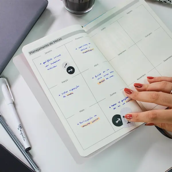Leve, compacto e fácil de transportar, o planner acompanha você em todas as suas jornadas, facilitando a gestão do tempo e das prioridades.
